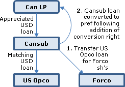 4) Can LP exercises the conversion right and converts the Cansub loan into preferred shares of Cansub having a redemption and liquidation value equal to the outstanding amount under the loan, converted into Canadian dollars on the date of the conversion. ... Cansub realizes a foreign exchange loss of Cdn$25 million. This loss is used to offset the Cdn$25 million gain realized upon the transfer of the US Opco loan to Forco.