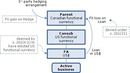 Dave Beaulne: Yes, it is our view that s. 261(21) would apply in these circumstances, mainly because the loan is on FAPI account, and therefore within the scope of s. 261(6.1), which means that FA, a US-dollar subsidiary, would have a tax-reporting currency of the U.S. dollar and, therefore, the conditions for the application of s. 261(21) would be met.