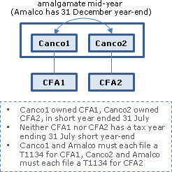 However I would note that the duplicate T1134s (specifically, the T1134 supplements to be filed by Canco 1 and Canco 2) would require limited to no information in various areas of that supplement. For example, Section 3 of Part 2 of the supplement, and Sections 1-4 of Part 3 of the supplement, specifically refer to taxation years of the affiliate ending before the entity’s taxation year. In the situation given, the amalgamation of CFA1 and CFA2 do not cause a year-end for the foreign affiliates.
