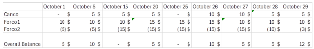 - On October 15th, as a result of a withdrawal, Forco2 increased its debit balance by $10M, bringing the overall balance to $0.