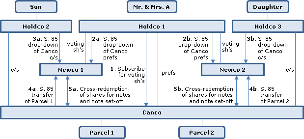 The purpose of the Proposed Transactions is to effect a division and transfer of Canco’s main assets into two separate companies as part of a business succession plan for Mr. A and Mrs. A and allow each of Child 1 and Child 2 (through their respective holding companies) to inherit an equal interest in the underlying assets.