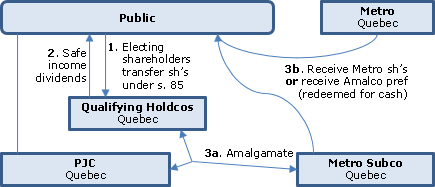 Under the proposed acquisition of PJC by Metro Inc. under a triangular amalgamation involving a subsidiary of Metro, PJC shareholders will be given a choice of cash or Metro shares (at an Exchange Ratio resulting in the receipt of 0.61006 Metro Shares per PJC share), subject to proration to accommodate the intended global allocation of cash of approximately $3.377 billion and Metro shares valued at approximately $1.126 billion. Cash (of $24.50 per PJC "Share") will be paid through the issuance of redeemable prefs of Amalco (having a paid-up capital of $24.50 per share, some of which might be derived from Metro Subco shares) which will be immediately and automatically redeemed. As an exception to this basic mechanic, a resident taxable PJC shareholder is given the option of rolling its PJC shares into a new single-purpose Quebec holding company, with that Holdco then being included in the amalgamation and with its shares effectively converted into Metro shares or cash in the same way. The extensive stated limitations on what a “Qualifying Holdco” is permitted to do permit various types of safe income dividends to be paid by the Qualifying Holdco. Similar planning occurred in the AIP acquisition of Canam. Stock options with in-the-money value are cashed out by PJC immediately before the amalgamation.