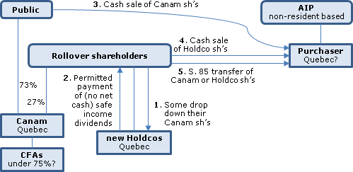- First, a group of shareholders, collectively holding 27% of the Canam shares and consisting of (i) the CEO (Mr. Dutil) or family members or holding companies, holding 12% of the shares, and (ii) two Quebec-based Funds, holding 15% of the shares, were permitted to first transfer their shares into new Quebec Holdcos (having no other assets, and no liabilities). The Holdcos were then permitted to pay specified types of dividends (e.g., under s. 84(1) or as stock dividends) to their shareholders. The Holdco shareholders then sold their Holdco shares as part of the Quebec Plan of Arrangement for cash consideration (corresponding to the transaction value of the underlying Canam shares) except as described below.