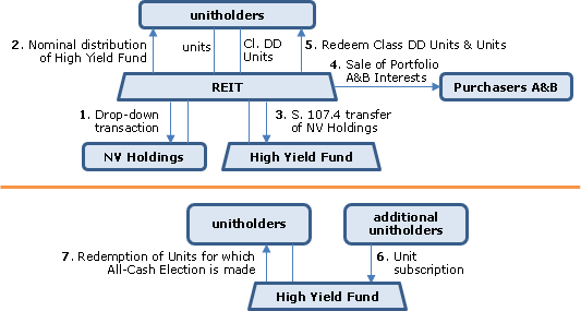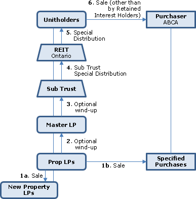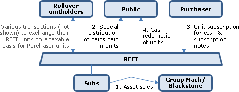 The REIT will sell its assets (essentially only the shares of a U.S. LLC (“U.S. Holdco”) indirectly holding its U.S. apartment portfolio) to a Starwood-affiliated purchasing LP (the “Purchaser”). The sale will not be subject to FIRPTA withholding given that Milestone is a U.S. corporation (and U.S. REIT) for Code purposes. In the case of the REIT’s unitholders, their pro rata portion of the capital gain will be distributed to them and their units will be redeemed with the balance of their share of the net proceeds (i.e., US$16.15 per unit, minus the portion distributed as a capital gain). U.S. investors hold Class B exchangeable units of a subsidiary Delaware LP of U.S. Holdco (“MMI LP”). MMI LP will be merged into a subsidiary LP of the Purchaser (the “Partnership Merger Sub”) with MMI LP as the surviving entity and with each exchangeable unit being converted into the right to receive US$16.15 in cash. Non-U.S. holders owning less than 10% of the REIT units (actually or constructively) will not be subject to U.S. FIRPTA withholding on the transaction.