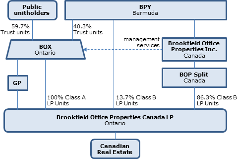 The REIT is a Ontario unit trust. It will hold the Class A LP Units of Maplewood LP, along with the shares of the Ontario General Partner, with some of the former shareholders of the Corporation holding the (exchangeable) Class B LP Units of Maplewood LP. Maplewood LP will hold all of the LP units of Maplewood Operating LP and the shares of the general partner, and also all the shares (being Class A Shares) of the Corporation, which will have nominal value. Maplewood Operating LP will own all the securities of B.V.